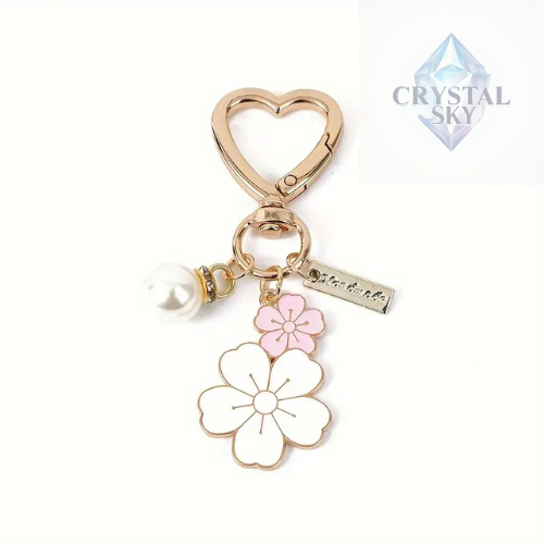 Breloc mic, elegant în formă de inimă cu accesorii în formă de floare metalică emailată şi perlă artificială.